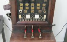 1890-es évek, 10 vonalas, falra szerelhető, helyi telepes telefonközpont.