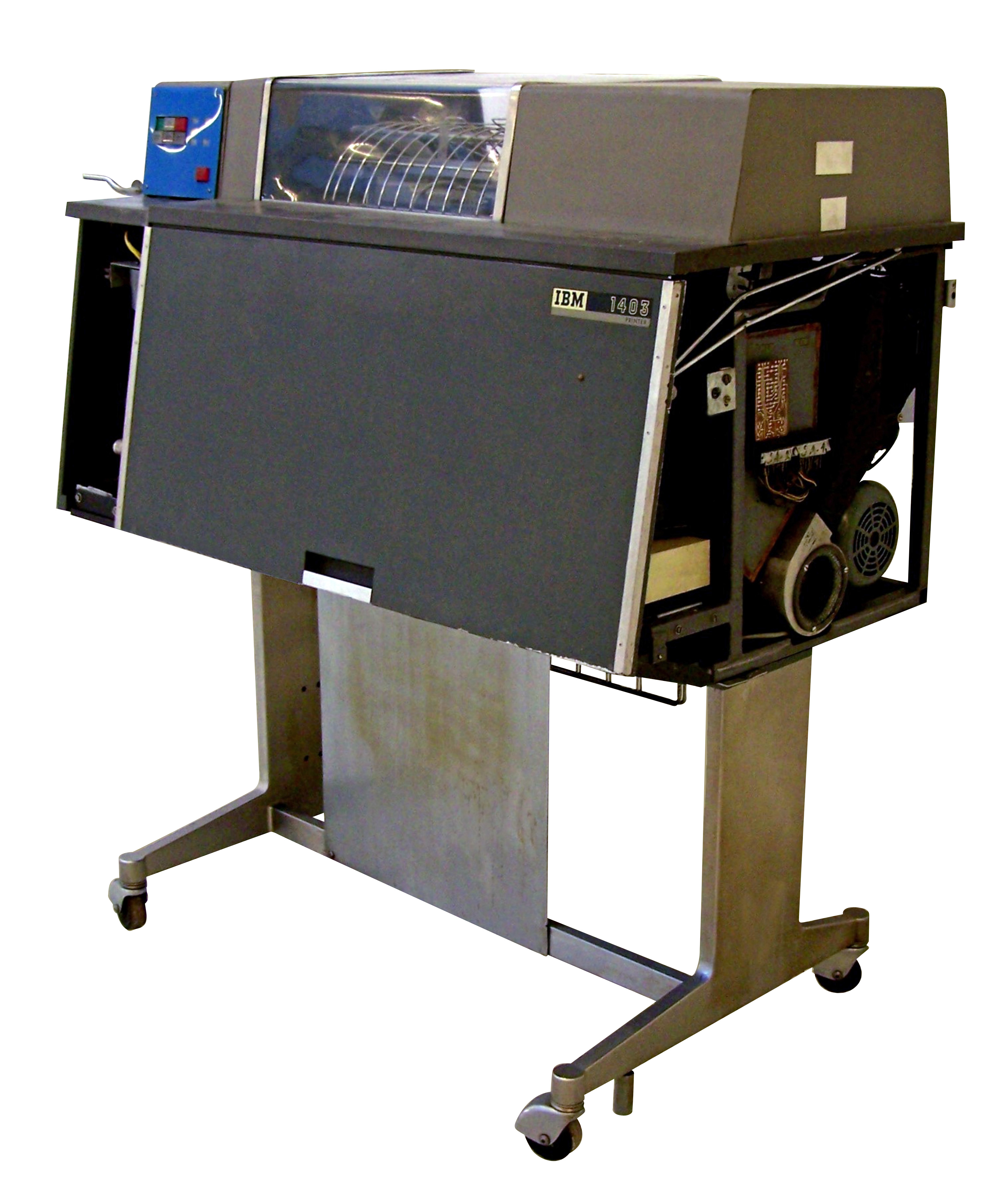 The IBM 1403 line printer was introduced in 1959 as a peripheral of the 1400 series. It was an extremely long-lived product, it was still used in the time of /370 systems. Its success can be attributed to the simpler and more flexible design and the chain mechanismused instead of the earlier drum solutions. It was developed in the same period as the ball-head typewriter, primarily due to its interchangeability.