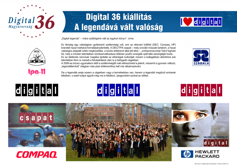 Maga a Digital36 kiállítás szól az anyavállalati, a DEC háttérről, a megkerülhetetlen KFKI TPA sikerekről, a TPA-ról, mint a hazai DEC kultúra megalapozójáról, a SZÁMALK szerepéről, ami megteremtette a hidat a saját gyártástól a kereskedelmi-szolgáltatói megközelítés elfogadásához. A DEC kultúra terjedés katalizátora a DECUS (The Digital Equipment Computer Users' Society), helyi csoportjaként előbb a HLUG (Hungarian Local User Group), aztán a HNUG (Hungarian National User Group), ahol a felhasználók egymásnak adták át a TPA, PDP, VAX, Alpha vagy a DECnet iránti lelkesedést. Emellett a tablókon a Digital Magyarország 1990-98 közötti életéből idéződnek fel karakteres események, két területet részletesebben bemutatva, azzal a hipotézissel élve, hogy ezek meghatározó szerepet játszottak a Digital sikerében. Ez a hazai saját – az anyavállalatétól megkülönböztethető – image, s a másik a szolgáltatás, megoldás fókusz, melyek lehetővé tették, hogy Magyarországon a felvásárlás valóban inkább összeolvadás lehessen. A szövegek mellett a vitrinekben a Digitalosok által elhozott tárgyak, relikviák egyrészt igyekeznek megtámogatni a tablók narratíváját, ugyanakkor személyes emlékekkel, sztorikkal teszik élőbbé a kiállítást.