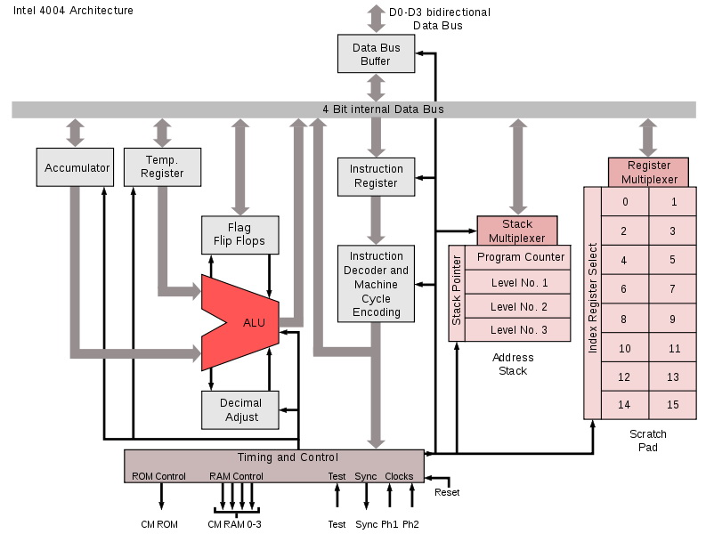 Even before microprocessors were invented, their architecture and logic design were already known, although it was not clear how a microprocessor could be made using silicon (to achieve better and faster performance). The 4004 used 10-micrometer silicon gate and PMOS technologies, and could do 92600 calculations per seconds. Its circuit was built of 2300 transistors, and contained 46 instructions and 16 registers.