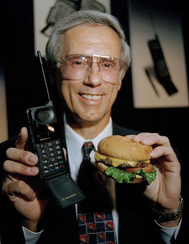 A Motorola embere 1984-ben azt szemléltette, hogy mobiltelefonja nem sokkal nagyobb egy sajtburgernél